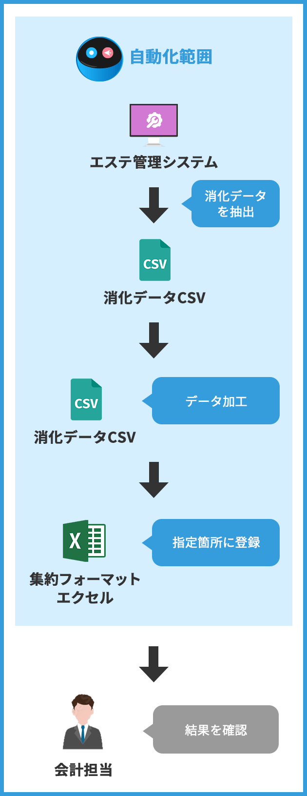 ロボの作業手順としては、まず「エステ管理システム」から消化データをCSVとして抽出します。CSVはそのままでは使えませんので、会計用のフォーマットで必要な項目のみ(期間など)のデータに加工します。そして、加工された消化データCSVを、集約フォーマットエクセルの指定箇所に登録します。