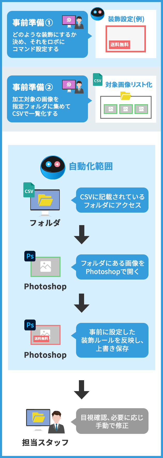 まず、ロボが指定のフォルダにアクセスし、そこに保存されている画像をPhotoshopで開きます。次に、赤い枠の装飾と「送料無料」のテキストを入力を、実際のPhotoshop上で操作します。加工が完了したら、データを保存するところまで自動で進めてくれます。